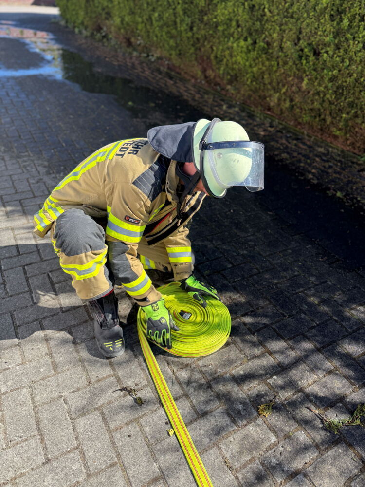 Die Rauchsäule des Heckenbrandes war schon auf Anfahrt sichtbar. Wir gingen mit einem Trupp unter Atemschutz und zwei D-Rohren vor. Die Hecke war so dicht, dass vermeintlich gelöschte Stellen immer wieder aufflammten. Wir mussten hier also relativ lange löschen. |