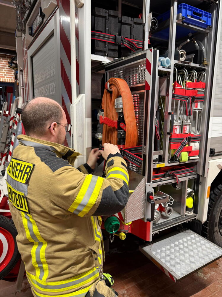 Kurz bevor der Alarm einging, war bereits eine deutliche Rauchsäule am Himmel zu sehen. Zunächst wurden wir in Richtung Hartensbergsee geschickt. Schnell stellte sich jedoch heraus, dass sich die Einsatzstelle auf der anderen Seite der Hunte, in Rüssen, befand. Unsere Einsatzkräfte fuhren die Einsatzstelle daher mit einem kleinen Umweg an. Die Feuerwehren Rüssen, Heiligenloh und Twistringen waren bereits vor Ort und löschten eine in Brand geratene Rundballenpresse. Der Fahrer hatte geistesgegenwärtig reagiert und den Traktor rechtzeitig in Sicherheit gebracht. Auch ein in der Nähe arbeitender Landwirt handelte schnell und rückte sofort mit seinem Grubber zur Unterstützung an. Unser TLF fuhr im Pendelverkehr, um gemeinsam mit der Feuerwehr Heiligenloh die Wasserversorgung sicherzustellen. Ein Kamerad unserer Wehr unterstützte unter Atemschutz bei der Brandbekämpfung. Mit der Seilwinde unseres LF wurde die hintere Klappe der Presse angehoben, um Zugang zu den Glutnestern zu schaffen. Zum Abschluss legten die Twistringer Kameraden einen Schaumteppich auf die Presse, wobei die Schaumpistole unseres HLF20 zum Einsatz kam. Auch unser WLF war vor Ort: Die Besatzung richtete einen Hygieneplatz ein und führte die entsprechenden Hygienemaßnahmen durch. |