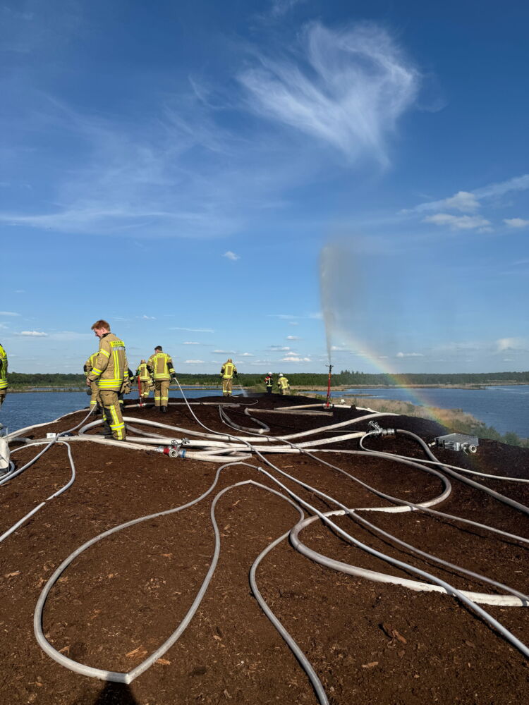 Über mehrere Stunden waren wir mit dem Ablöschen, Prüfen und Messen eines in Brand geratenen Hackschnitzelhaufens beschäftigt. Dabei wurden wir von mehreren Feuerwehren unterstützt. Zur Brandbekämpfung setzten wir mehrere Kreisregner ein. Zusätzlich wurden die betroffenen Bereiche mit zwei D-Rohren und zeitweise auch per Wasserwerfer benässt. Regelmäßig wurden Probebohrungen durchgeführt und die Temperaturen im Inneren kontrolliert. Während des laufenden Einsatzes ging eine weitere Alarmierung ein: Kurz darauf erhielten wir eine weitere Meldung über ein mögliches Feuer im Moor. Zur Überprüfung fuhren wir den betroffenen Bereich mit unserem Polaris Ranger sowie einem Quad ab, außerdem unterstütze uns die FF Visbek mit ihrem UTV. Zusätzlich erfolgte eine Kontrolle per Drohne sowie mithilfe eines Fernglases vom Aussichtsturm am Haus im Moor. Nach gründlicher Prüfung konnte jedoch Entwarnung gegeben werden – vermutlich handelte es sich bei der gemeldeten Rauchentwicklung um aufgewirbelten Staub, verursacht durch eine landwirtschaftliche Maschine. Fotos: O. Gabelmann (FF Düngstrup) und FF Visbek |