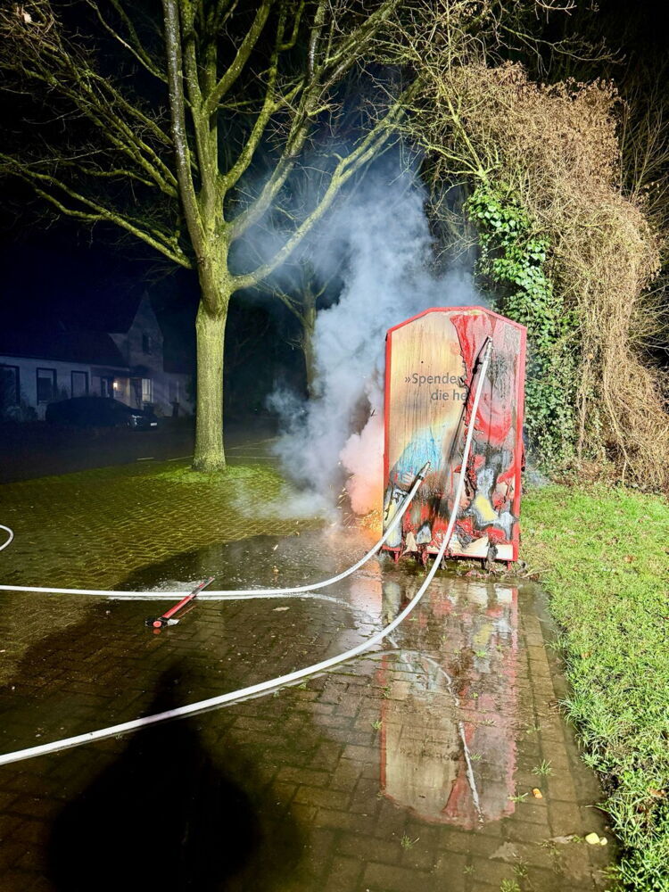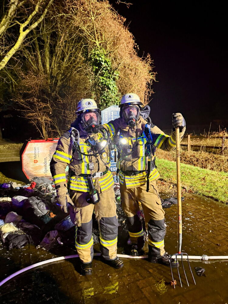Der erste Silvester-Einsatz Jahr führte uns in Richtung Sportplatz. Dort war ein Kleidercontainer in Brand geraten. Zu Beginn setzten wir Fognails zum Einsatz. Anschließend öffneten wir die vordere Klappe mit dem Trennschleifer, holten die Kleidung mit einer Forke heraus und löschten diese mit einem D-Rohr ab. |